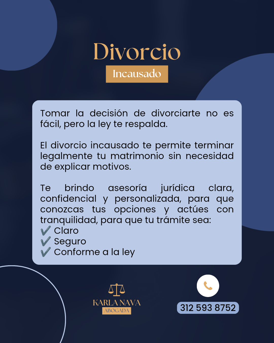 Lawyer Karla Nava is a respected legal professional based in Cdad. de Villa de Álvarez, Colima, offering reliable and personalized legal advice. Located at Zapote Blanco 973, she provides dedicated assistance to individuals seeking effective and committed legal solutions. With a perfect 5-star rating from genuine client reviews, Karla Nava is recognized for her ability to understand clients’ needs and guide them through complex legal processes. Her professional and ethical approach ensures clear and effective outcomes, making her a trusted choice for legal services in the area. For consultations and legal support, she can be reached at 312 593 8752 or through her profile at https://directoriocolima.com. Lawyer Karla Nava stands as a point of interest in the local legal community, supported by client satisfaction and her commitment to justice.