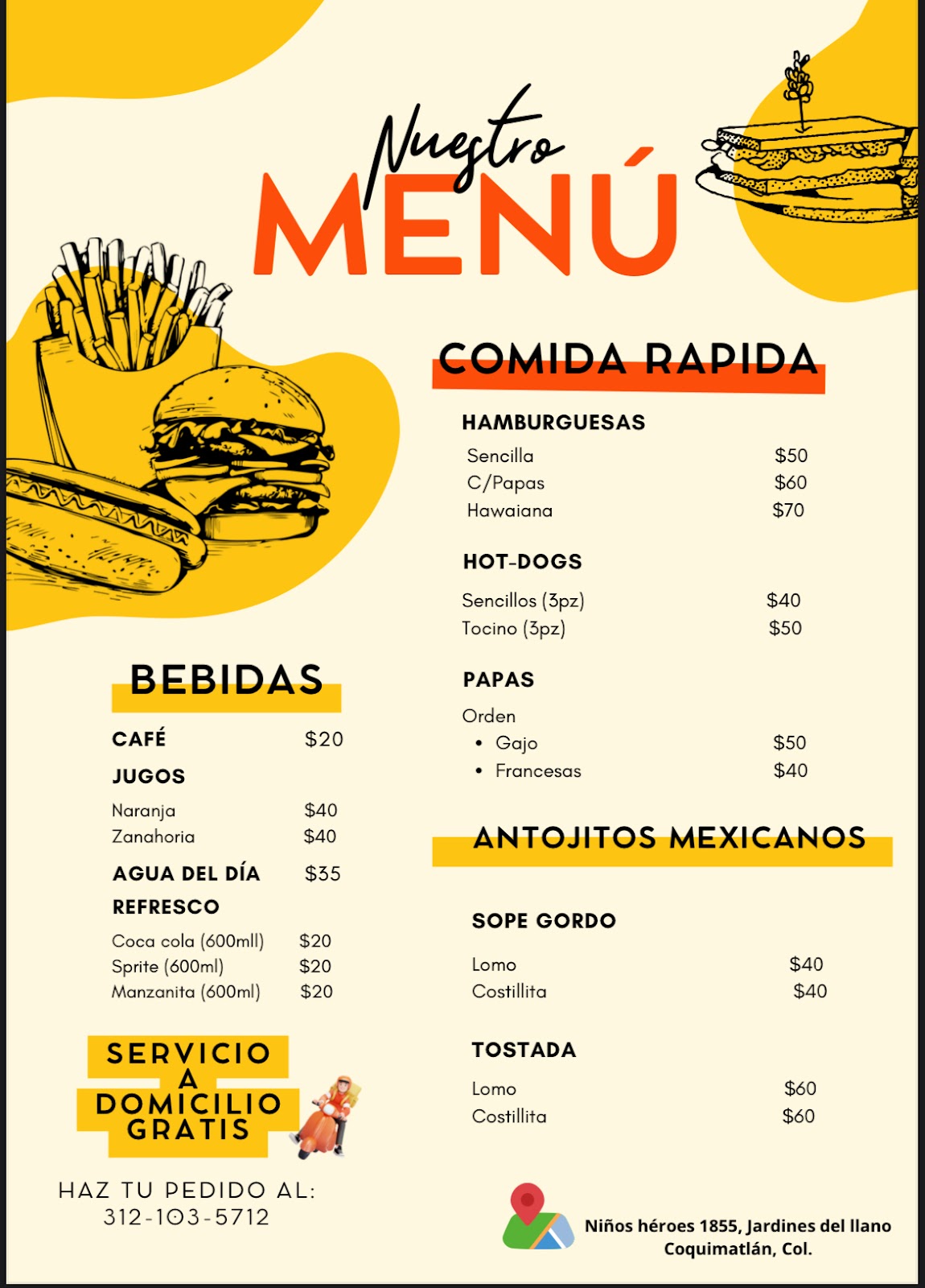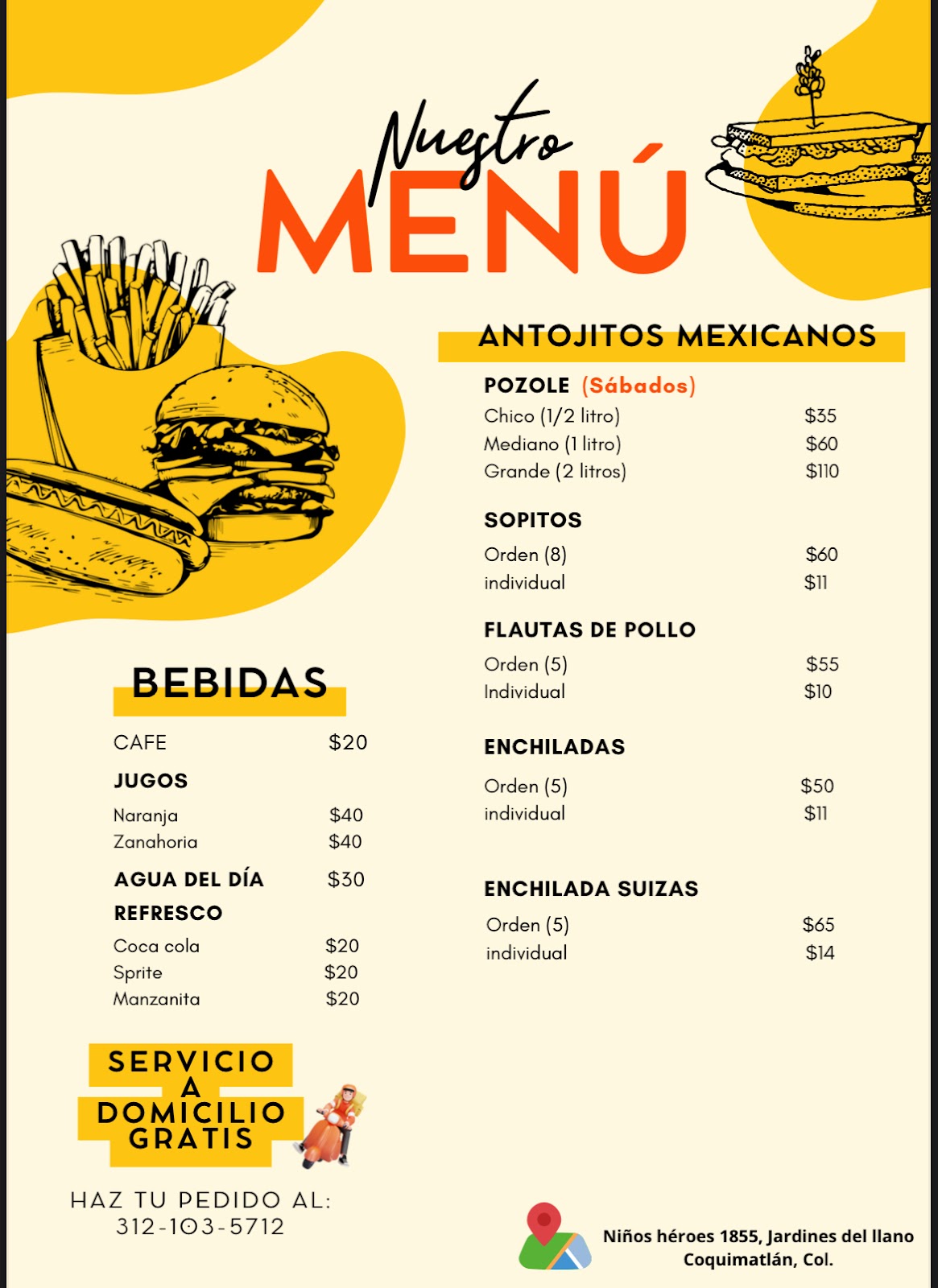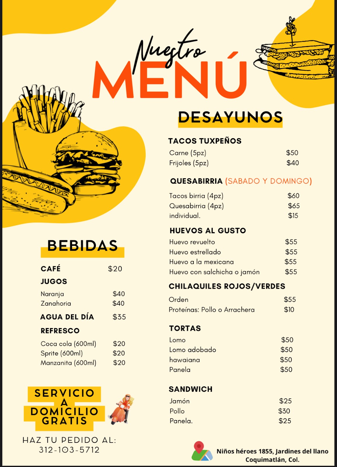 Antojitos Mañaneros is a restaurant located in Coquimatlán, Colima, specializing in authentic Mexican snacks to start the day with flavor and tradition. Situated at Niños Heroes 1855, Jardines del Llano, this establishment is known for its welcoming atmosphere and commitment to quality in every dish. Ideal for those seeking to enjoy a local culinary experience, Antojitos Mañaneros offers a variety of options that reflect the rich culinary heritage of the region. Whether for a quick breakfast or a casual meal, this point of interest stands out for its customer service and accessible location. Visitors can contact them at 312 103 5712 or visit their website https://directoriocolima.com for more information. Although it currently has no Google reviews, Antojitos Mañaneros represents a reliable choice for those wanting to explore the typical cuisine of Coquimatlán.