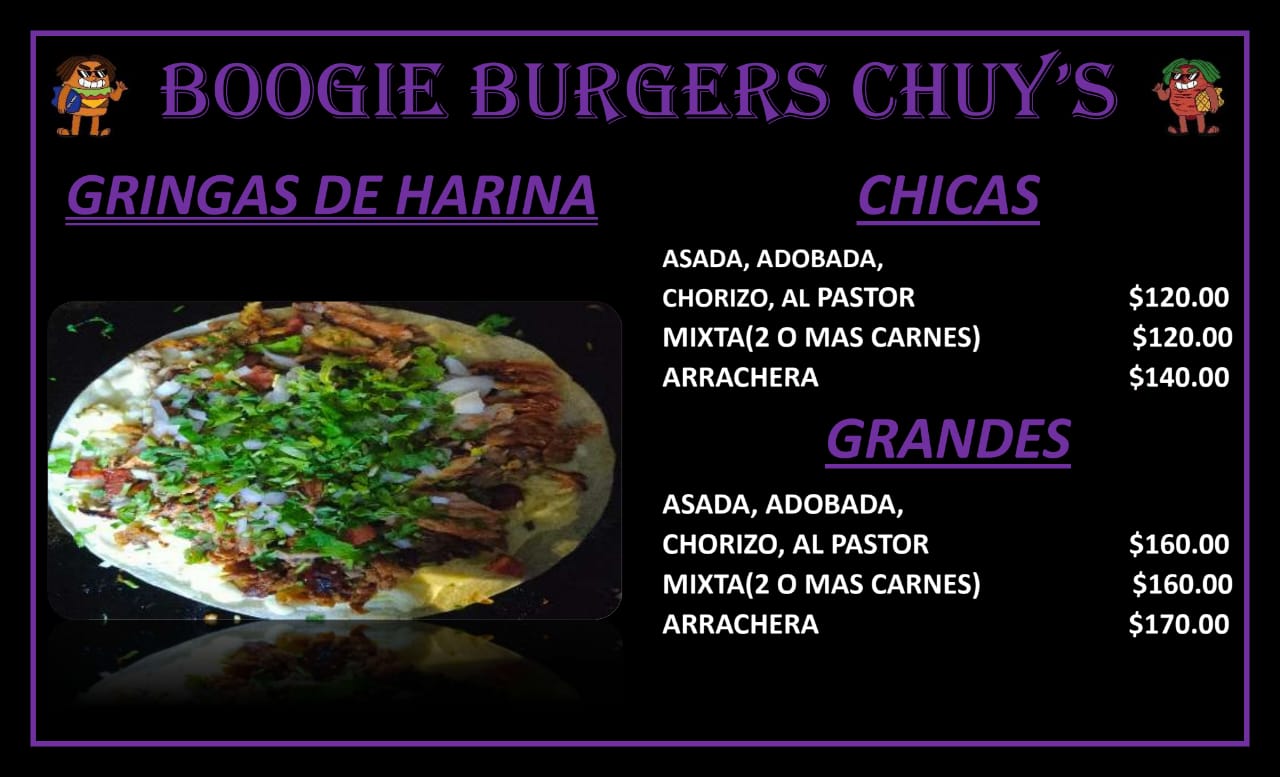 Boogie Burgers Chuys, located at Av. México 472c, San José in Manzanillo, is a local restaurant known for its delicious food and excellent service. With a Google rating of 4.6 out of 5 based on 27 reviews, it offers a variety of dishes including tacos, nachos, burgers, and gringas. Customers appreciate the generous portion sizes and value promotions such as the 3-for-2 taco deal available on Tuesdays and Thursdays. The restaurant is small, making it perfect for takeout or dining in a quiet setting. Patrons consistently praise the quality of the food and the reasonable prices. Boogie Burgers Chuys has become a popular point of interest for food lovers in Manzanillo, offering a welcoming atmosphere and fast service. For more details or to place an order, call 314 357 7823 or visit their Facebook page at https://www.facebook.com/boogieBurgerschuys/.