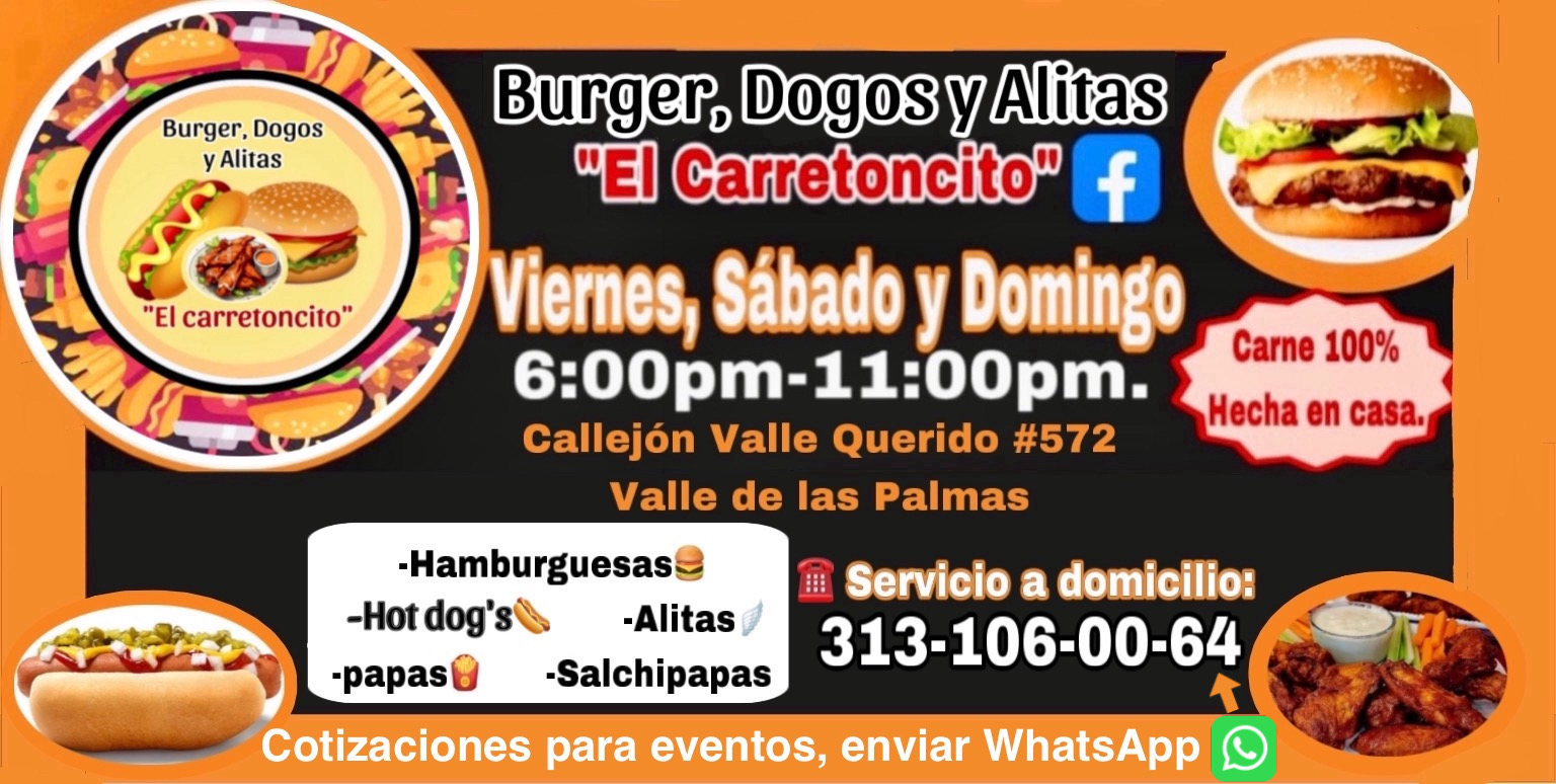 Burger, Dogos y Alitas “El Carretoncito” is a restaurant located in Tecomán, Colima, specializing in a diverse menu of burgers, hot dogs, and wings. Situated at Calle Cjon. Valle Querido 572 in the Valle Querido neighborhood of the Valle de las Palmas area, this establishment is known for its welcoming atmosphere and personalized service. It is an ideal destination for those seeking a quick and tasty dining experience, offering classic American dishes with a local twist. Although it currently has limited online reviews, its dedication to quality and flavor makes it a notable culinary spot in the region. Customers can contact the restaurant at 313 106 0064 or visit their Facebook page for more information or to place orders. This restaurant is a great choice for casual dining in Tecomán, providing a balanced combination of taste, price, and service.