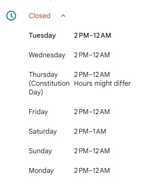– Jueves: 2PM–12AM (puede variar)